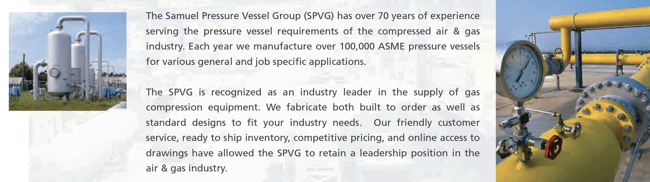 ABOUT THE MANUFACTURER; Samuel Pressure Vessel Group (Samuel PVG), part of the family of Samuel companies, is a global leader in the design, manufacture and distribution of pressure vessel solutions. With a heritage that includes Steel Fab, Silvan Industries, Northland Stainless, and LZR FIT, Samuel PVG's fabrication abilities are virtually limitless.