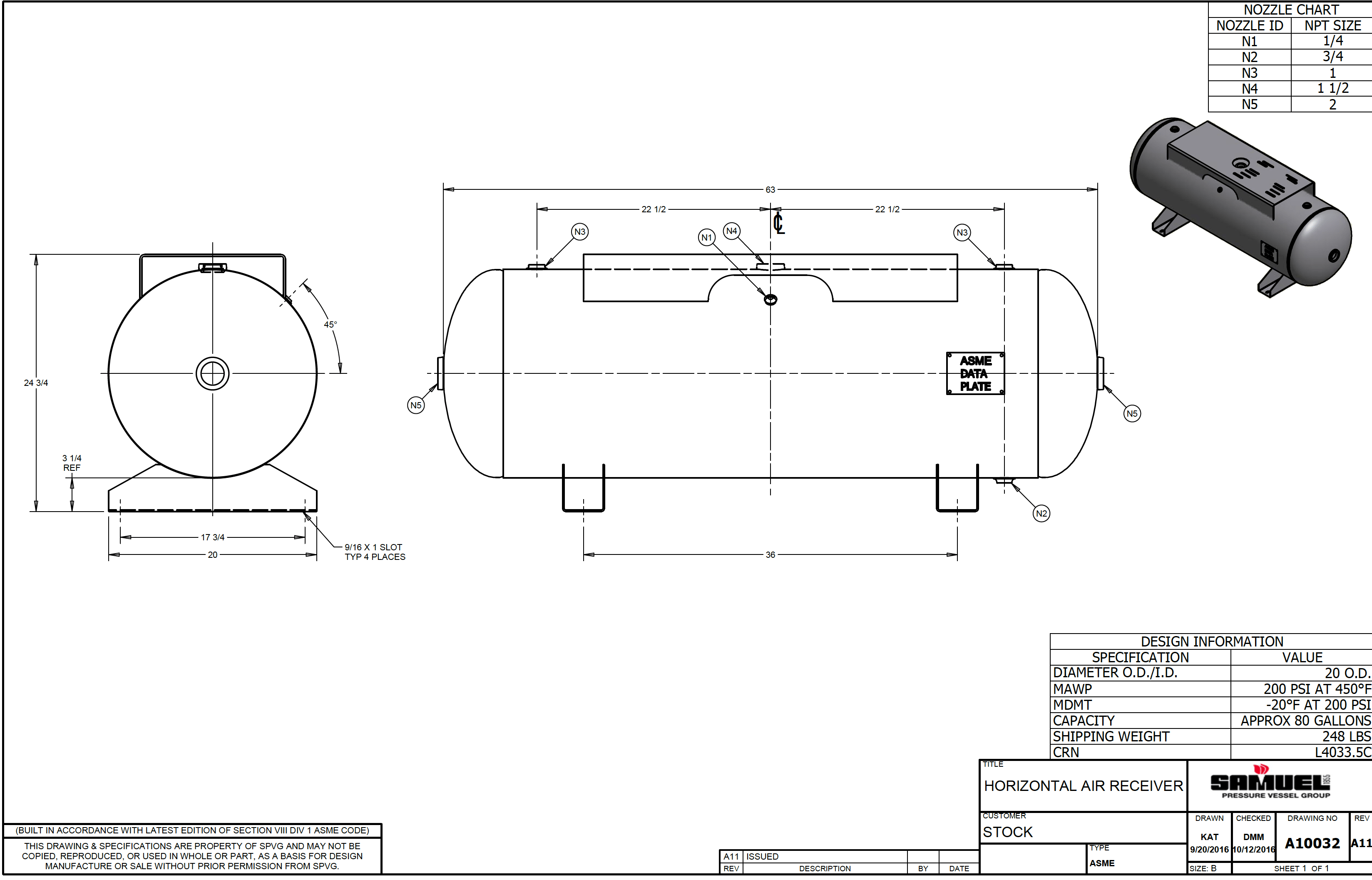 80 Gallon Horizontal Air Tank with Top Plate (12" x 34") Overall 20" x 63", 200 PSI ASME Coded | A10032