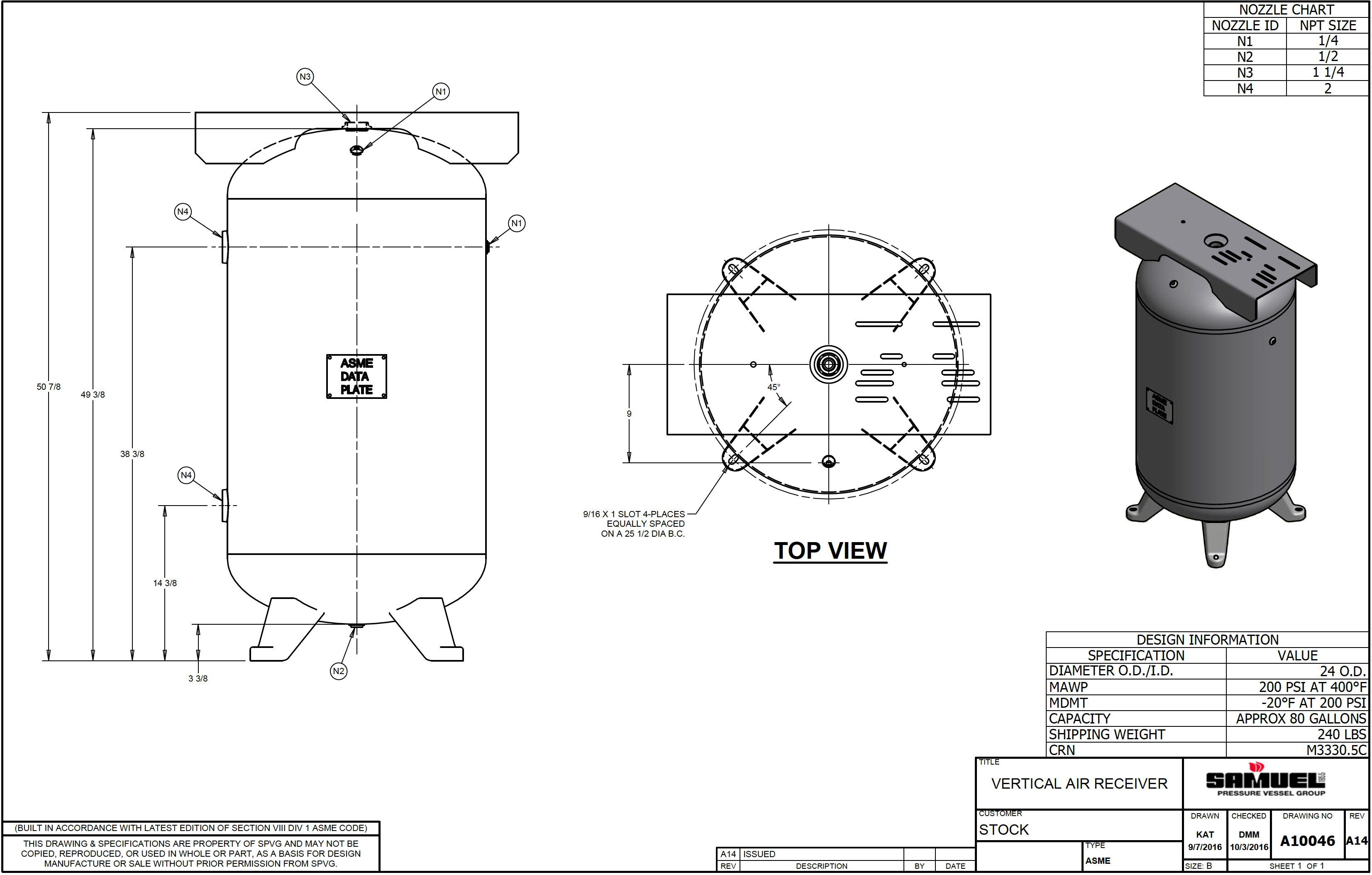 SteelFab 80 Gallon Vertical Air Tank with Top Plate (13" x 30"), Overall 24" x 45" with Feet, 200 PSI ASME Coded | A10046